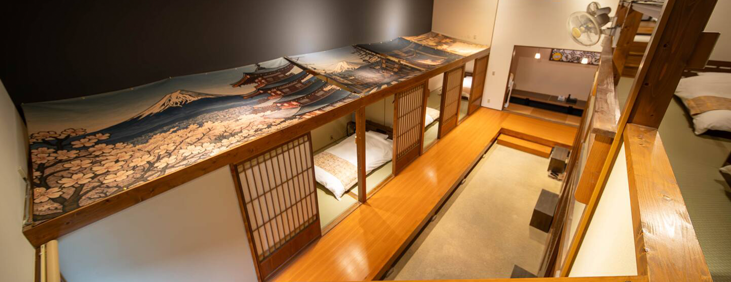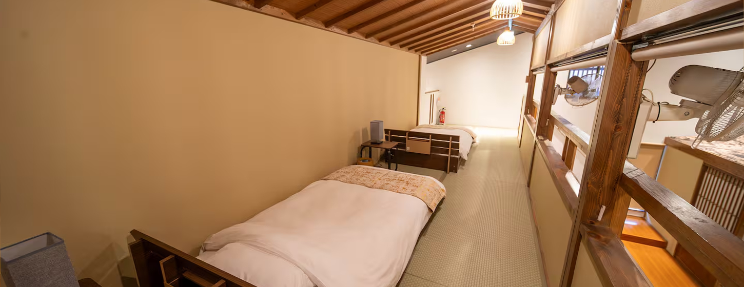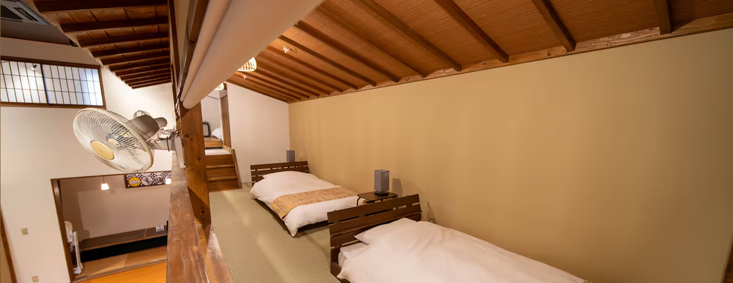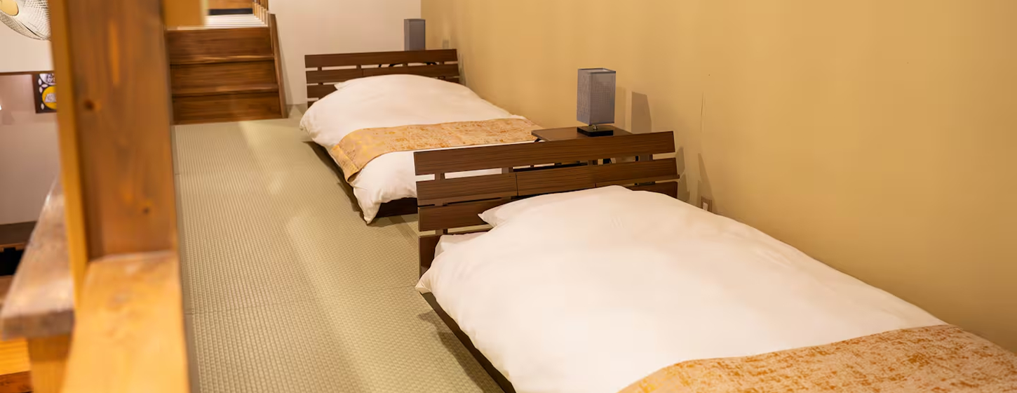 奥の階段からロフトへ行くことができますROOM3は、シングルベッド2台を備えた寝室